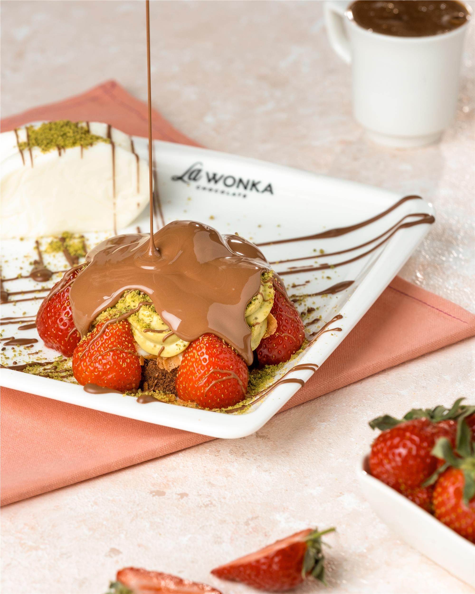 Kakaolu pandispanya kekin mükemmel dokusu, La Wonka’nın özel sade kreması ve Antep fıstıklı krema ile buluşuyor. Çilek, ince krep kırıkları ve bolca Antep fıstığı ile zenginleştirilen bu eşsiz lezzet, özel sütlü Belçika çikolatası ve kesme Maraş dondurması ile taçlandırılarak damaklarda unutulmaz bir tat bırakıyor.